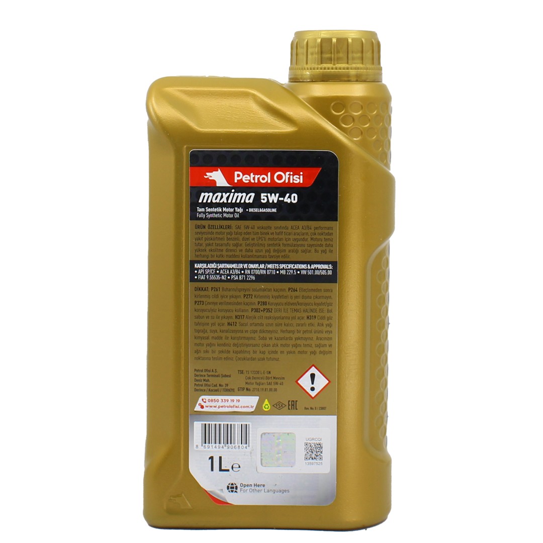 Petrol Ofisi Maxima 5W40 1 Lt Tam Sentetik Motor Yağı